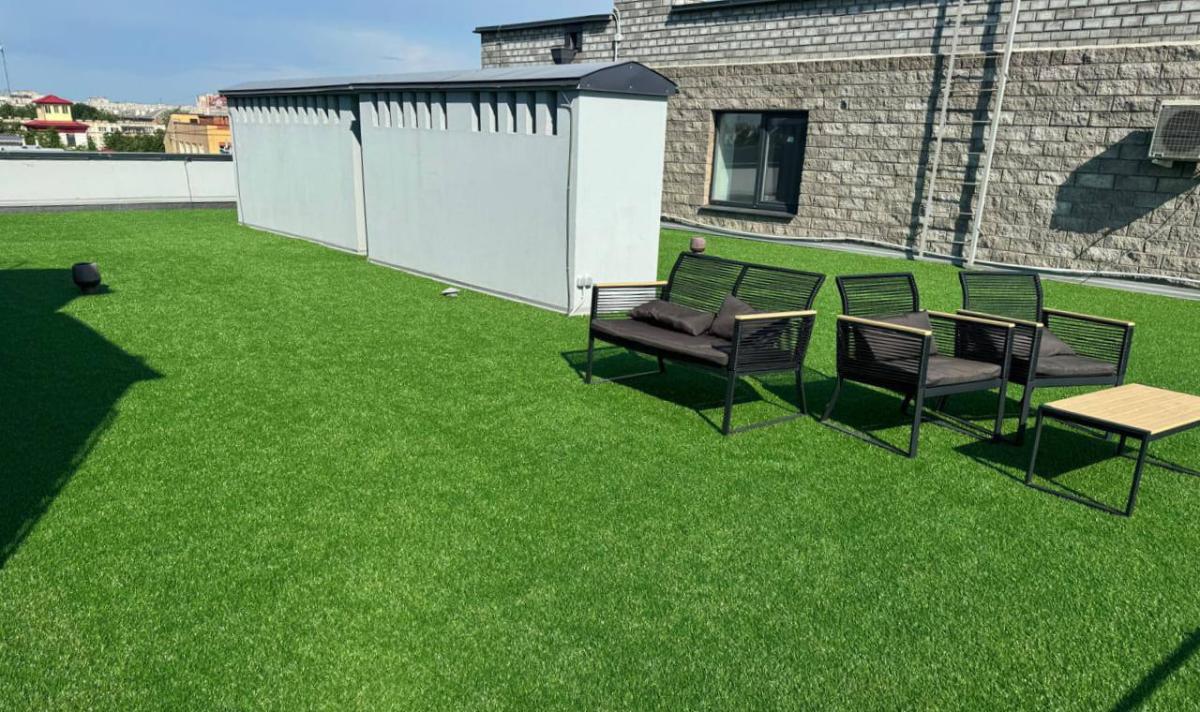 Искусственная трава на крыше офисного здания - это удобное и экологически чистое решение для создания комфортной и зеленой среды в городской джунглях